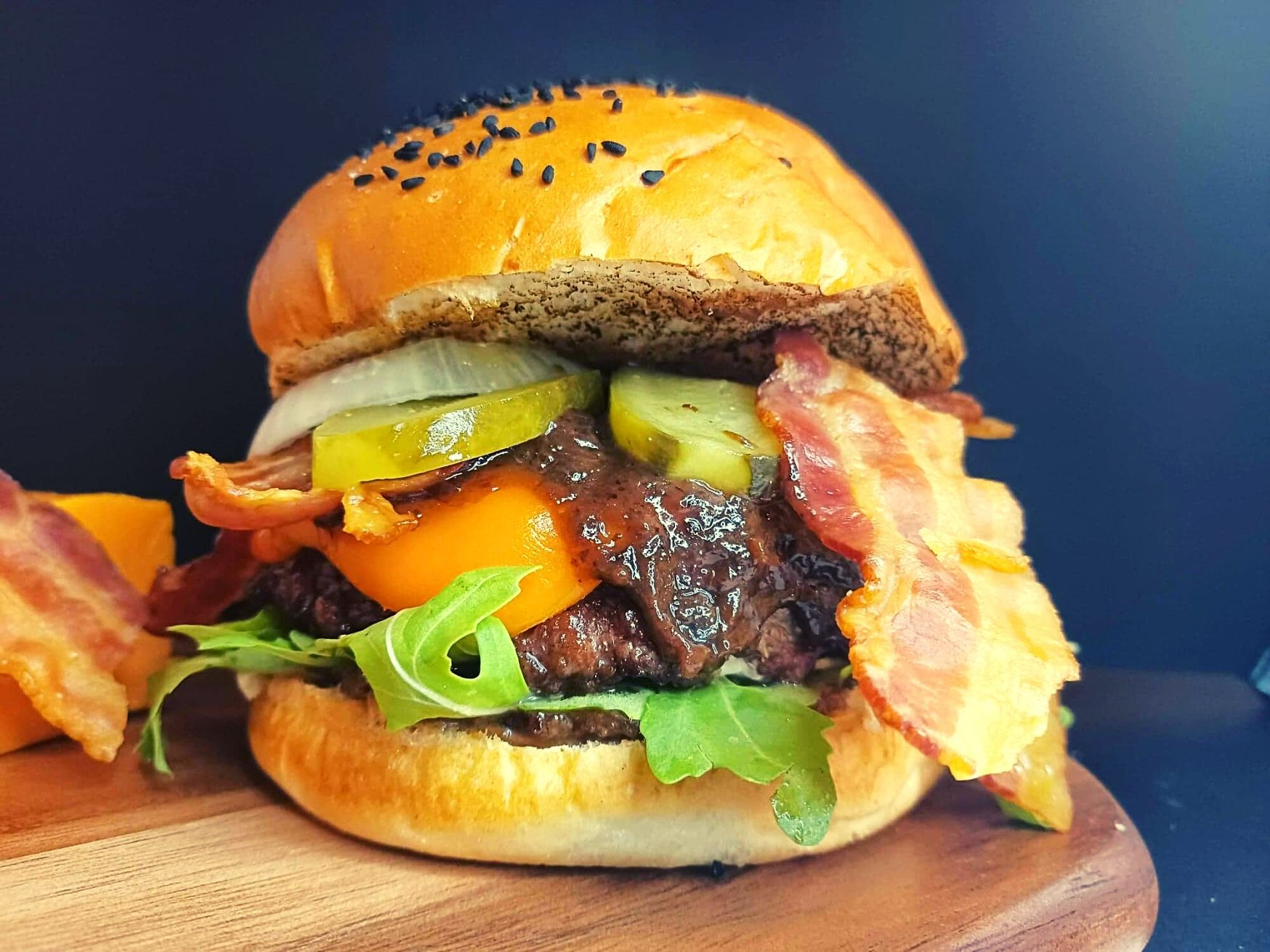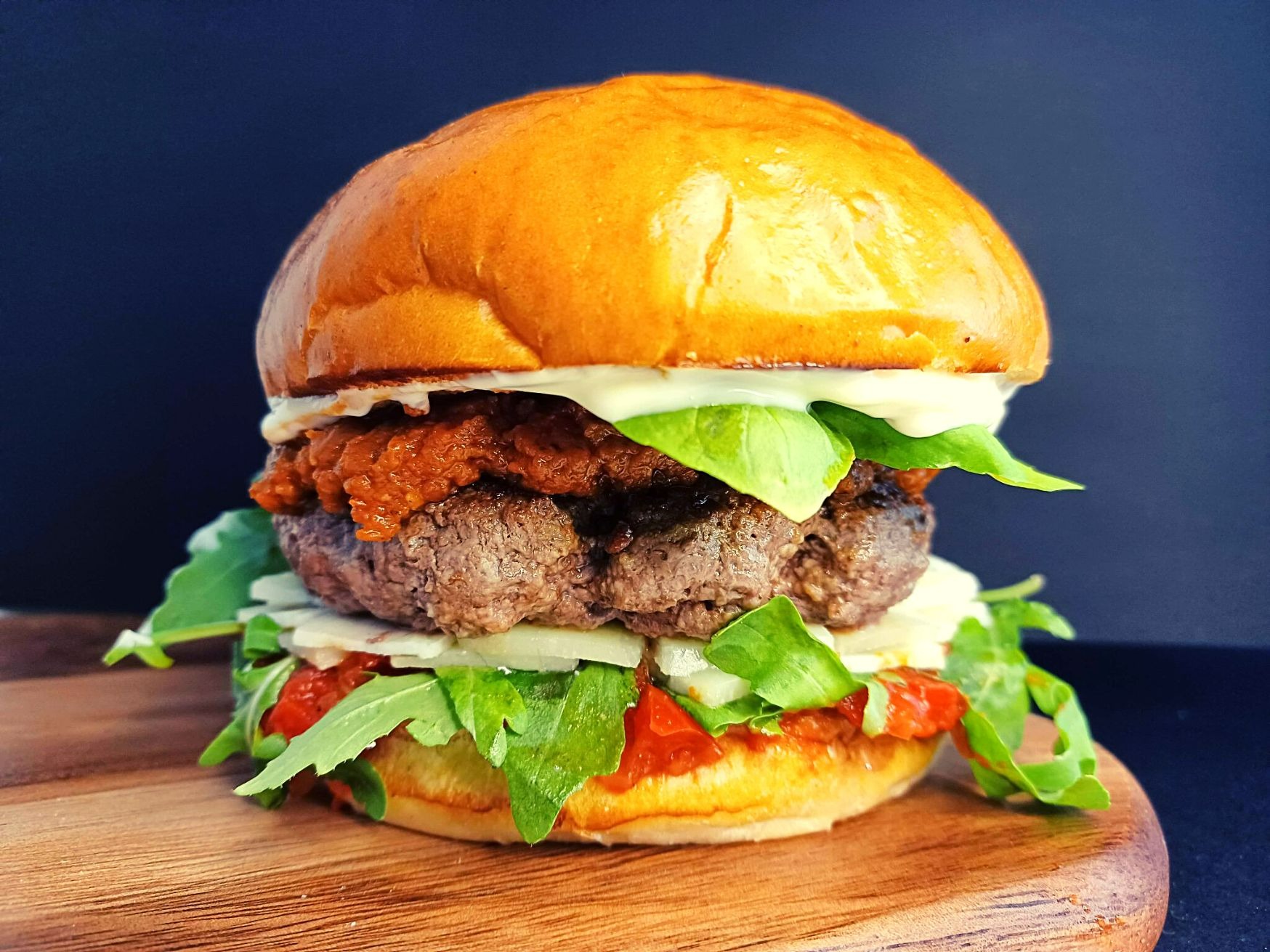 Wołowina 215g, (sos Relish na włoskich pomidorach),sałata, ser Pecorino Romano, pasta z suszonych pomidorów, bazylia, nasze mayo